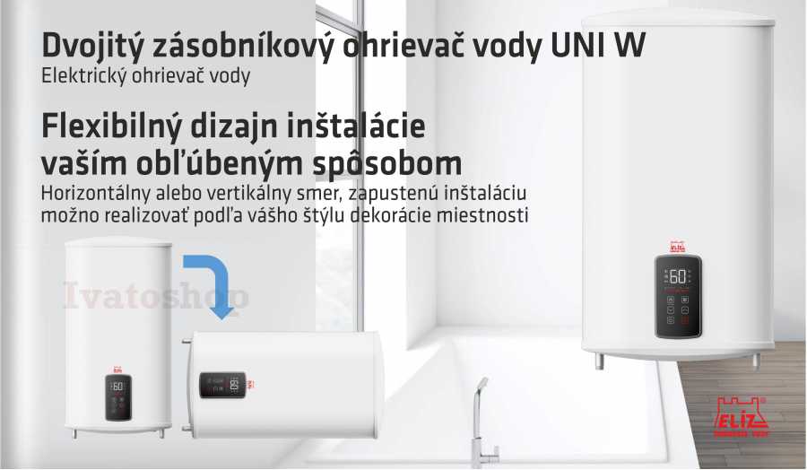 Elektrický tlakový ohrievač vody ELÍZ UNI 100 W je vyhotovený v plochom prevedení s konceptom dvoch nádrži. Každá nádrž je vybavená samostatným ohrievacím telesom. Je určený pre zvislú alebo vodovorovnú montáž a je vhodný pre jedno alebo viac odberných miest. Hĺbka ohrievača je len 295 mm.